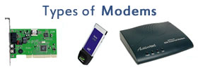 Internal and external modems. The external modem is connected to serial port by use of an Ethernet cable. Internal modem is basically modem card. To add it to the system unit of your system you have to use one of the expansion slots.